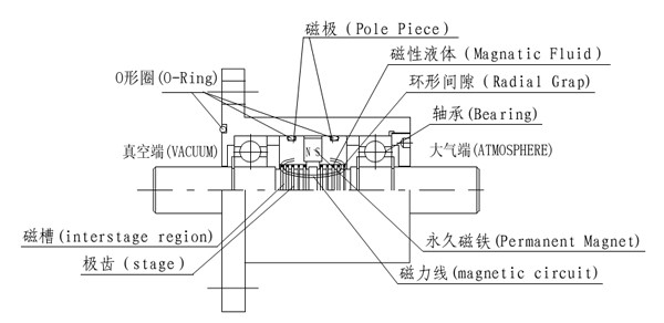 • 磁流體密封原理:磁流體密封技術(shù)就是利用磁流體對磁場的良好響應(yīng)特性而實(shí)現(xiàn)的。當(dāng)把磁流體注入到由高性能的磁鐵,導(dǎo)磁良好的極靴與旋轉(zhuǎn)軸所構(gòu)成的磁回路間隙中,在磁場的作用下,磁流體在間隙中形成數(shù)個液態(tài)的“O”形圈,從而起到密封作用。